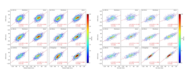 图1. DCOI和漠河站流星雷达(左)、榆中站钠激光雷达(右)探测经向风和纬向风在五个高度和高度加权平均后的风速相关性比较分析。