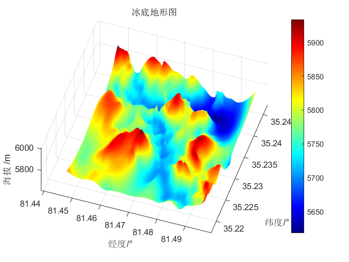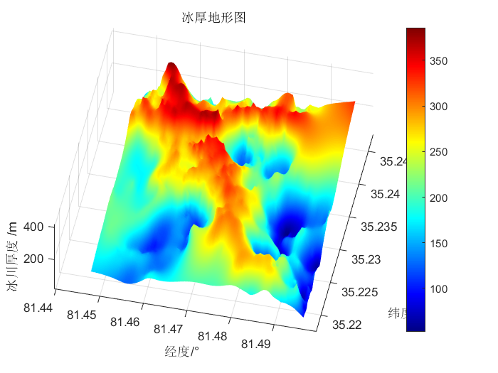 图1冰川厚度图清晰地呈现了冰川的厚度分布情况。数据显示,古里雅冰川最厚处约为370米,位于(81.46°E,35.24°N)。值得注意的是,这一位置与1992年和2015年古里亚冰川科考的地面探测结果高度吻合。通过冰川厚度分布图,可以准确计算古里雅冰川的储量和变化情况,为冰川物质平衡研究提供了宝贵的数据支持。在探测精度方面,科研团队使用冰芯附近的多航线散射回波进行二维插值计算得到冰芯位置的冰深为309.81米,与2015年古里雅高原冰芯钻取长度309.73米仅相差0.08米,验证了此次探测工作的精度和准确性。