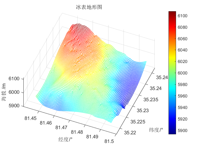 图3冰川表面海拔地形图显示,尽管古里雅冰川是平顶冰川,但其冰表地形仍存在一定的起伏。根据航空冰雷达优于0.5米的垂直分辨率,机载惯导和GPS设备的定位能力,将有助于监测和估计冰川的消融过程。