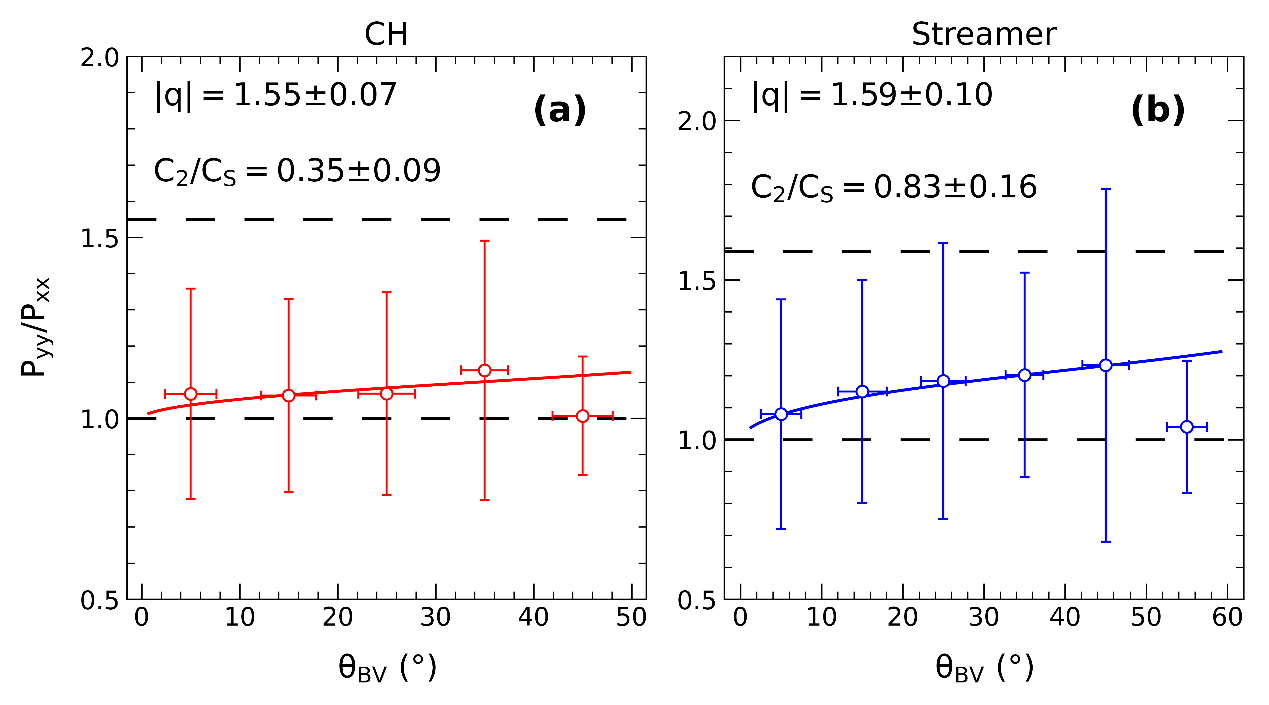 研究人员采用两分量模型(2D and slab 湍流模型)来量化冕洞和冕流太阳风的波矢各向异性特征。图1展示了基于两分量模型的建模结果和观测结果的对比。观测结果表明,在冕洞风和冕流风中,切向功率各向异性随采样角度增加而增强,而两分量模型的结果也可以较好地重现这一趋势。根据建模结果,研究人员发现,与 1 au 处太阳风明显不同,在PSP观测到的冕洞太阳风中,惯性区能量仅有 26% 与 2D 波动相关。而在冕流太阳风中,这一比例增加到 45%。研究人员认为,随着太阳风向 1 au传播,惯性区的各向异性串级使得能量逐渐集中于垂直波矢,因此导致了1 au处太阳风中2D波动比例相较于年轻太阳风显著提高。此外,冕洞和冕流太阳风的波矢各向异性之间的差异可能反映了在日冕源区形成的各向异性波动的原始特征。
