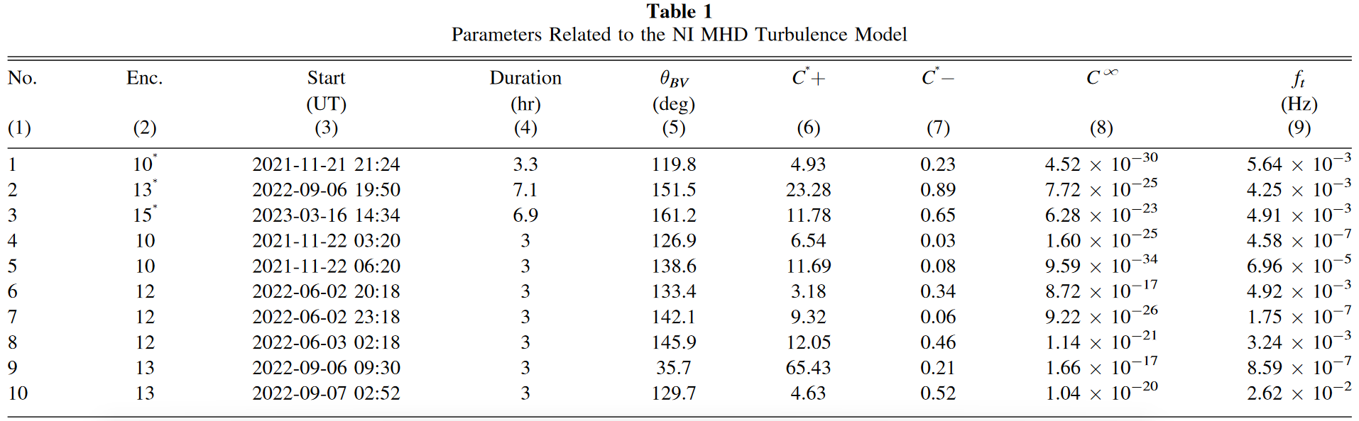 研究人员使用近不可压缩磁流体动力学(NI MHD)湍流模型来描述 LMBL 风的波矢各向异性。表 1 总结了NI MHD 湍流模型的相关参数。我们选择近亚声速太阳风区间以及倾斜的亚阿尔芬太阳风区间作为 LMBL 太阳风的代表区间。模型结果显示,在LMBL风的所有代表区间中,slab波动仍然占主导(C*±/C∞≫ 1)。综合所有分析结果,0.3 au以内的年轻太阳风中均展现出相较于1 au处更为丰富的slab波动,这可能为理解日球层中太阳风湍流的演化提供新的线索。