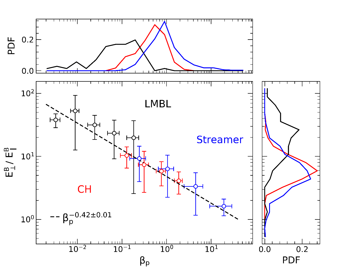 图2展示了来自不同源区的年轻太阳风的方差各向异性特征随着质子等离子体βp的演化。早期模拟工作和1 au 观测结果均表明,方差各向异性与质子等离子体βp呈负相关,而研究人员发现这一关系在 0.3 au内的年轻太阳风中依然成立。方差各向异性最弱出现在质子等离子体βp值最高的冕流太阳风中,而最强则出现在质子等离子体βp值最低的LMBL太阳风中。研究人员认为,处于极端质子等离子体βp值条件下,冕流和LMBL太阳风方差各向异性差异的结果可能揭示了来自日冕源区的湍流的遗留特征。