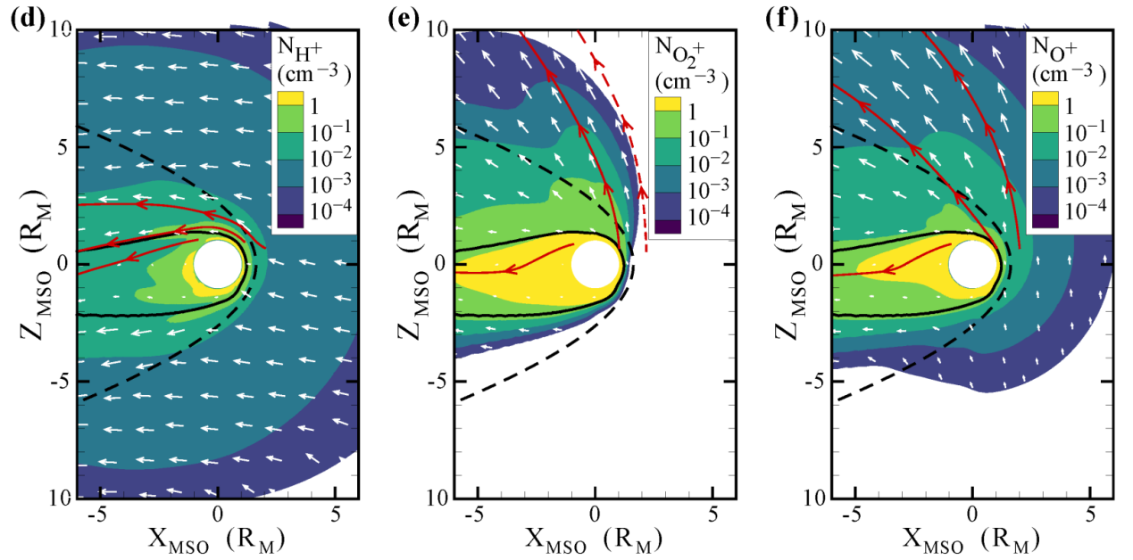 图1显示,作为基本的等离子体界面,离子成分边界(ICB)位置调节着拾取离子逃逸的效率,因为ICB位置上方的离子运动受太阳风对流电场(Esw)的控制。对于氧离子和氧分子离子来说,沿Z轴的非对称密度分布源于其受Esw驱动的摆线运动的大曲率半径:nq(Esw+U×B),其中n、U和q分别是离子的密度、速度和电荷,B是磁场。相比之下,氢离子表现出与太阳风流对齐的尾部逃逸轨迹(图d),因为它们的拾取回旋半径小于火星感应磁层的特征尺寸。红线轨迹表明,氧分子离子被ICB处的强Esw有效加速,形成离子羽流,并确认了它们的电离层起源,而拾取的氢离子起源于ICB之外,因为ICB处加速的氢离子由于其较小的回旋半径而可以再循环回电离层。对于拾起的氧离子,起源包括电离层离子和电离的外逸层粒子(图f)。虽然ICB外的拾取离子可能会被局部电磁场部分偏转到磁尾,但磁尾内的体输运仍然以密集、缓慢移动的电离层出流为主。