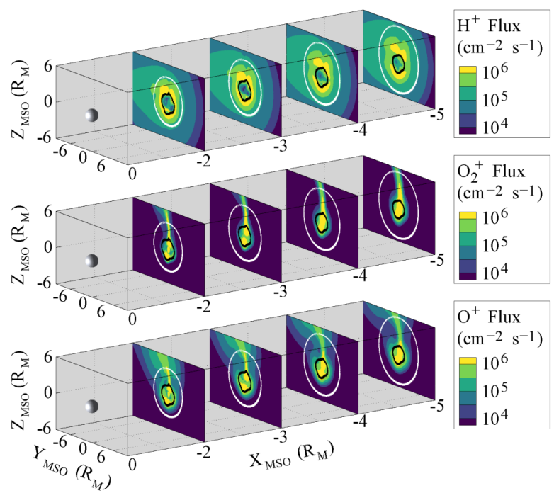 图2火星尾向(-X方向,X指向太阳)离子通量。小球代表火星位置,白色实线是弓激波位置,黑色实线是离子成分边界。可以发现氢离子的通量集中在磁鞘区域,而氧离子和氧分子离子通量集中在磁尾(离子成分边界以内)。