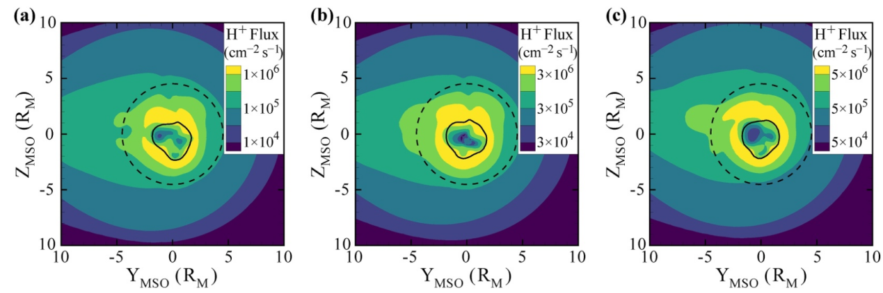 图3火星氢离子逃逸的变化性。(a)(b)(c)的结果分别在(a)火星岩石磁场位于夜侧、(b)火星南半球夏季沙尘暴和(c)行星际日冕物质抛射(ICME)通过的条件下,穿过X=-3 Rm平面尾向(-X方向,X指向太阳)的氢离子通量。黑色的实线是离子成分边界,黑色虚线是弓激波。