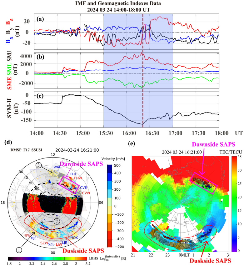 此次研究聚焦 2024 年 3 月 24 日发生的强磁暴事件。数据显示,该磁暴 SYM-H 指数最小值低于 - 170 nT(属强磁暴等级),同时伴随超强亚暴(SME 指数最大值超 4000 nT)。多雷达联合探测揭示:在空间分布上,昏侧 SAPS 呈现 “广覆盖、低TEC” 特点,位于中纬度低密度槽(TEC<10 TECU),延伸约7个磁地方时(MLT:20.5-3.5);而晨侧 SAPS 则分布在TEC 值超 35 TECU的区域,延伸约2个磁地方时(MLT:8-10)。时间演化层面,两类 SAPS“异步出现、长短不一”:昏侧 SAPS在雷达上于15:37 UT(世界时)率先出现,16:40 UT 消失,持续约 1 小时;晨侧 SAPS 则延迟至 16:07 UT 出现,16:30 UT 即消失,持续不足 30 分钟,展现出更短的生命周期,提示其对磁暴强度变化的响应更敏感。值得注意的是,尽管两类SAPS等离子体流方向相反(昏侧西向、晨侧东向),且处于不同的电子密度区域(晨侧SAPS处于电子密度较高的区域),但该事件中两类 SAPS 的流速峰值却大致相当, 均超 1000 m/s。该观测厘清了两类 SAPS 在空间分布、时间演化及形成条件上的关键差异,为探索晨侧SAPS的独特驱动机制提供了新方向。