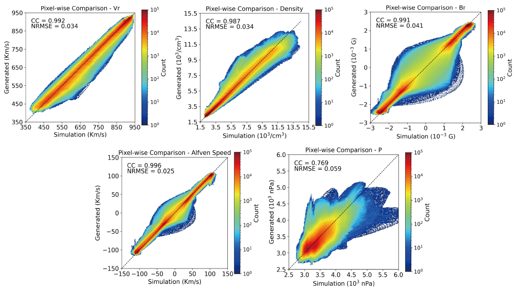 模型在测试集上取得了高精度的重建结果:径向速度、数密度和径向磁场的相关系数分别达到0.992、0.987和0.991;推导的阿尔文(Alfvén)速度与动压的相关性分别达到0.996和0.769。模型不仅准确再现了关键太阳风参数的空间分布,还成功捕捉了其随时间变化的动态演化规律。
