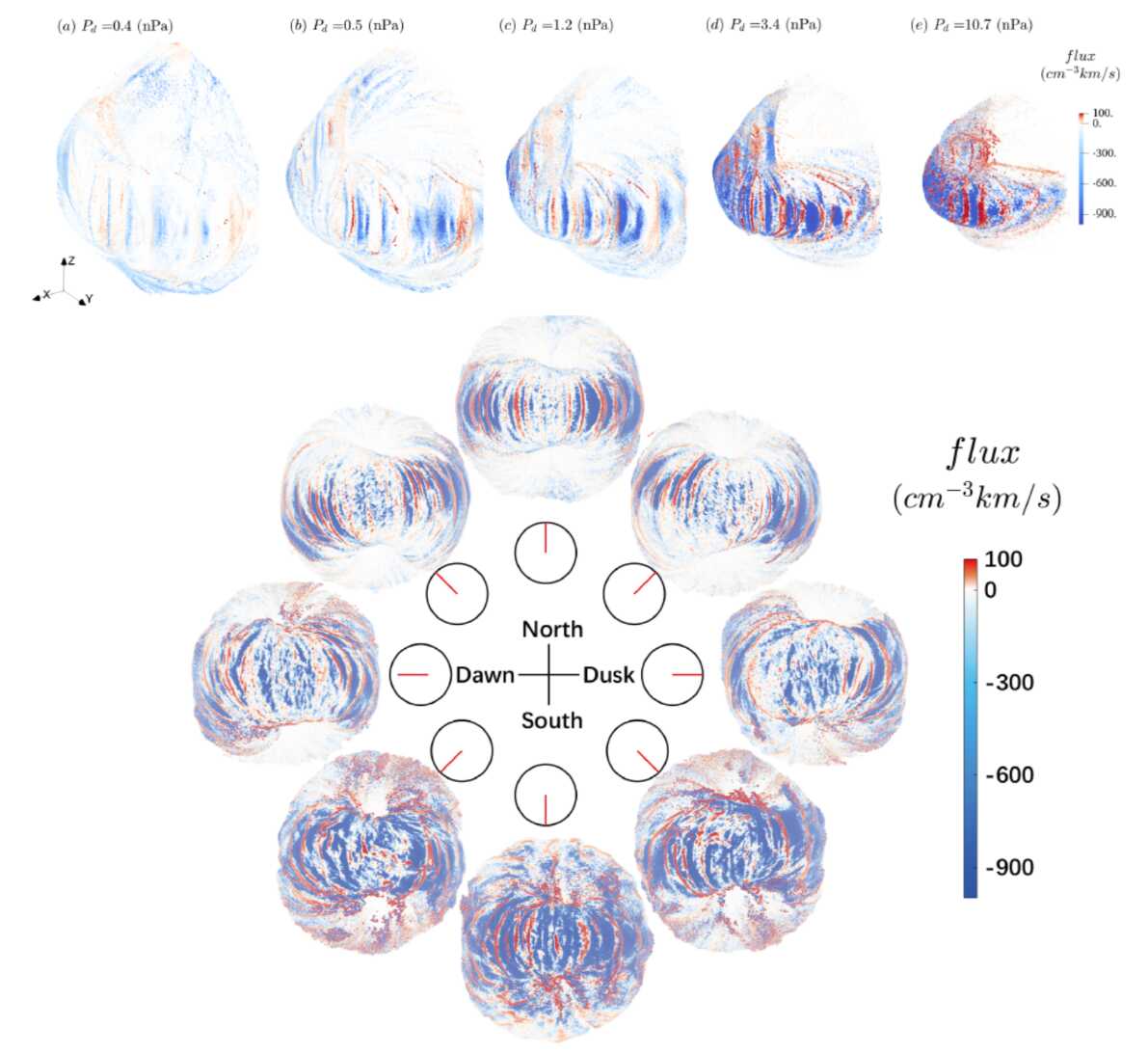 图2. 不同(上)太阳风动压和(下)IMF时钟角下,太阳风和行星粒子在边界层的注入(蓝)和逃逸(红)。
