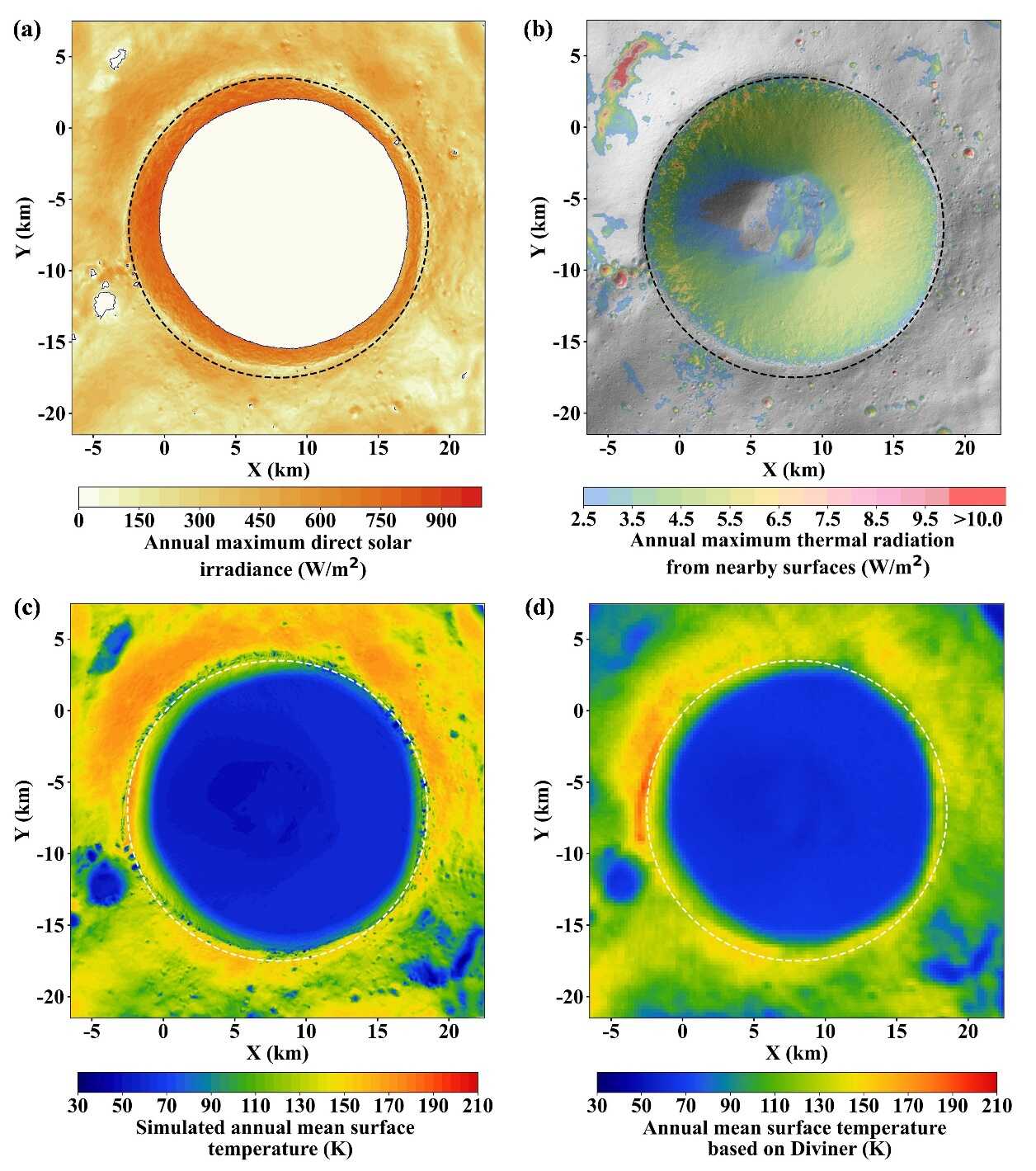 图2 研究区域的光照与表面温度:(a)直接太阳辐射的年最大值,实线为PSRs;(b)热辐射的年最大值,未着色区域为热辐射最大值小于2.5 W/㎡的区域;(c)模拟的年平均表面温度,沙克尔顿撞击坑内部的空间分辨率为~50 m/px;(d)Diviner观测温度的年平均值,空间分辨率为~240 m/px。虚线圈出为沙克尔顿撞击坑的坑缘。