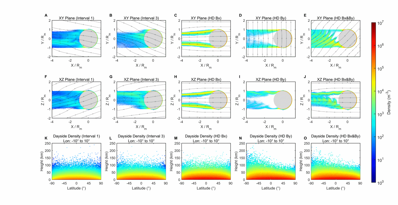 为评估H⁻对月球空间环境的影响,本研究进一步利用蒙特卡洛测试粒子模拟揭示了其空间分布特征。在向阳面,由于光致解吸效应,H⁻被限制在紧贴月球表面的薄层内,密度随高度迅速衰减,50公里以上降至10⁵ m⁻³以下。在背阳面,由于该区域处于月球阴影区内无太阳光照,光致解吸效应消失,H⁻被电磁场拾起后可形成延伸数个月球半径的长负离子尾。这一新发现的带电粒子组分可参与填充月球尾迹区的等离子体空腔。在极端太阳风密度事件期间,H⁻密度可比正常条件高出10倍以上,其可能对月球空间环境带来显著影响,比如产生一些等离子体波动等。