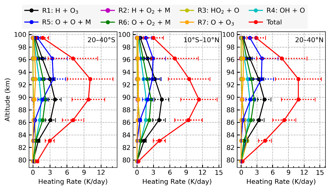 中间层顶区域(约80–100 km)是连接低层大气与高层大气的关键过渡区,动力学、光化学与能量过程在此紧密耦合,是日地空间全链条研究中的关键环节。该区域的能量收支是中高层大气研究的核心科学问题之一,能量平衡在很大程度上依赖于原子氢、原子氧等活性成分参与的放热化学反应所释放的化学加热。然而,由于关键反应物难以直接探测,加之OH气辉辐射机制本身存在不确定性,目前该区域长期的全球化学加热速率产品主要依赖热层-电离层-中间层能量学和动力学卫星(TIMED/大气宽带发射辐射测量仪(SABER)的单一反演,缺乏多源独立观测的有效约束。这一现状制约了对中间层顶能量收支的定量认识,也限制了相关过程在大气模式中的准确表征,亟需基于最新物理参数的独立反演结果加以交叉验证。