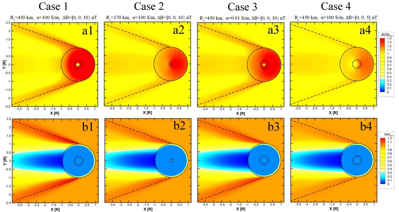 在此基础上,研究团队进一步通过数值模拟研究月核半径、月核电导率以及上游磁场变化对月球内部感应响应及其所引起的临边压缩的影响。结果如图三所示:较大的月核半径、较高的电导率以及较强的磁场变化,均会增强感应磁场并产生更明显的压缩特征。然而,当月核电导率超过0.1 S/m时,进一步增加电导率对结果影响不大。相关结果与经典导电球体磁感应理论预期一致。该研究揭示了月球导电核在太阳风与月球相互作用中的重要作用,也为未来结合数值模拟与嫦娥七号磁场观测数据进一步约束月球内部结构提供了重要参考。该项研究成果发表在Monthly Notices of the Royal Astronomical Society上。