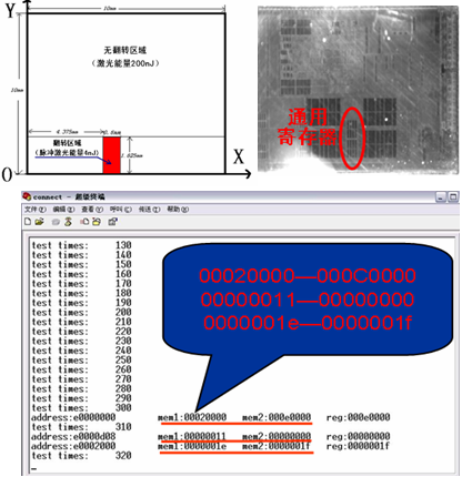 试验获得了SRAM器件单粒子锁定的微区分布,并测得了其发生单粒子锁定的阈值,与加速器重离子的试验结果非常吻合。激光扫描试验测得了CPU对单粒子翻转最敏感的部位;随后对该器件进行的版图分析表明,该部位正是此CPU芯片的通用寄存器所在区域。试验观测到脉冲激光诱发的该CPU一位和两位单粒子翻转及其对计算机系统的影响。