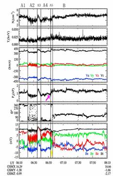 太阳风动压和行星际磁场非同步到达磁层顶,太阳风动压先于行星际磁场至少约5分钟。通过与经验公式的对比,在磁鞘内部,行星际磁场是以磁鞘流的速度向磁层顶运动的,然而太阳风动压的传播需要比磁鞘流更高的速度。这需要新的机制来解释太阳风动压从弓激波向磁层顶的传播。他们的研究结果还首次给出了连续磁重联触发的内禀时间:南向行星际磁场到达磁层顶后,在两分钟内触发了连续磁重联,而四分钟后触发了瞬时重联(通量传输事件)。不同的重联触发内禀时间反映了不同的磁重联物理过程。目前,这两类磁重联现象有何联系还是个问题,但同一行星际磁场南向事件同时触发连续重联和瞬时重联对这一问题在时间尺度方面给出了线索。