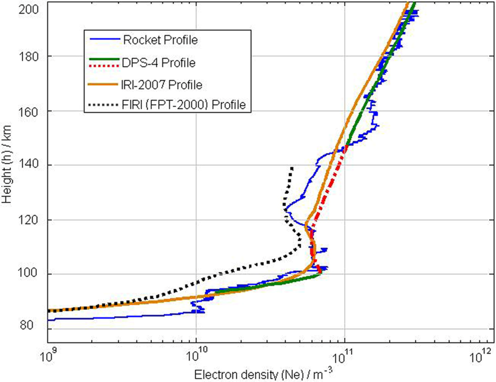 图:探空火箭实地探测到的电离层E-F谷区,以及与地基测高仪探测结果的对比。 |