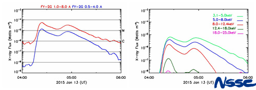 图1 左图:2015年1月13日FY-2G卫星探测到M5.7级耀斑;右图:FY-2G卫星太阳X射线精细能谱清晰反映了M5.7级耀斑爆发时大气加热过程