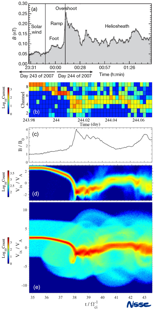Voyager 2号飞船观测到的日球层终止激波(a)磁场和(b)离子分布函数;全粒子模拟得到的终止激波(c)磁场和(d)离子分布函数(模拟Voyager飞船的法拉第杯粒子计数范围)。(e)模拟中完整形态的离子速度分布函数(包含所有的太阳风离子和Pickup ions)。 |