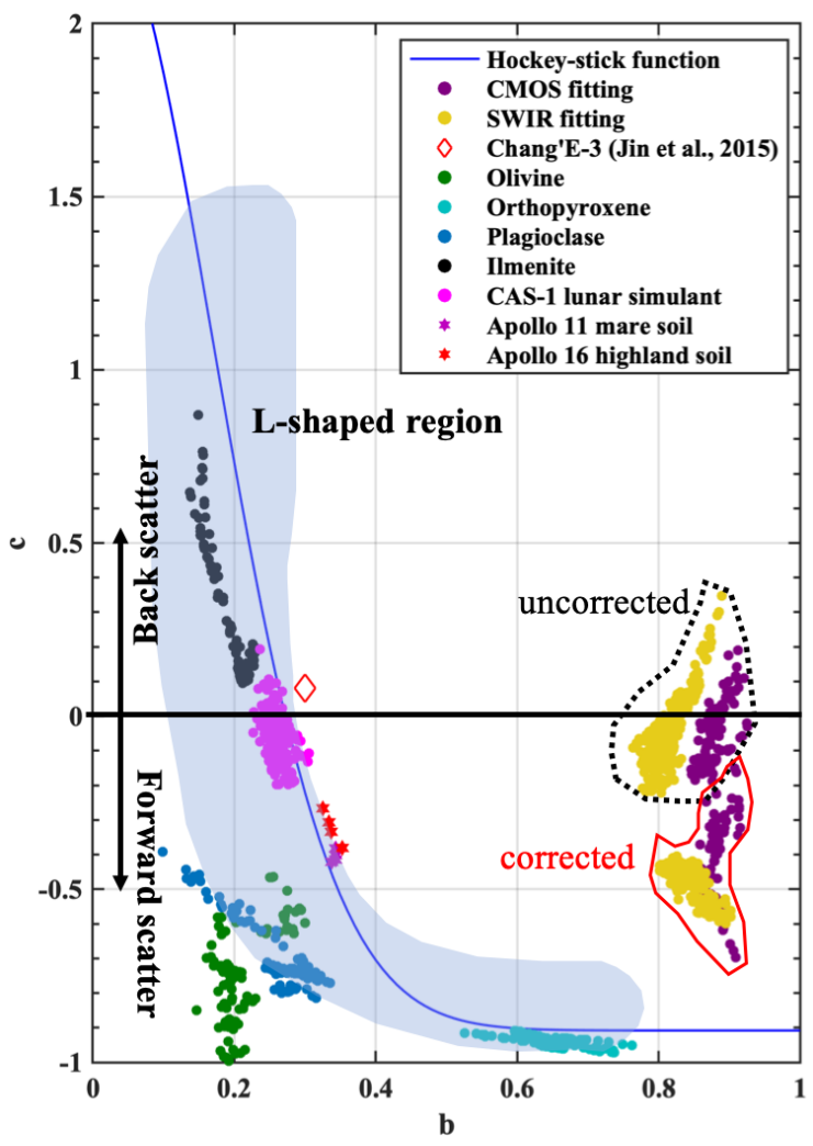 图四:Henyey-Greenstein相位函数参数b和c的关系,表征月表矿物颗粒的散射特性。