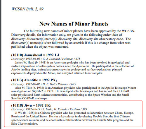 COSPAR国际合作奖是国际空间研究委员会单独设立的奖项之一,旨在表彰为空间科学国际合作做出突出贡献的科学家。吴季研究员是该奖项自1984年设立以来,第一位获此殊荣的中国籍科学家。从2018年开始,COSPAR国际合作奖的获奖者还将获得一颗小行星的命名。今年7月5日,经国际天文联合会(IAU)批准,编号为10118的小行星被命名为“吴季星”。