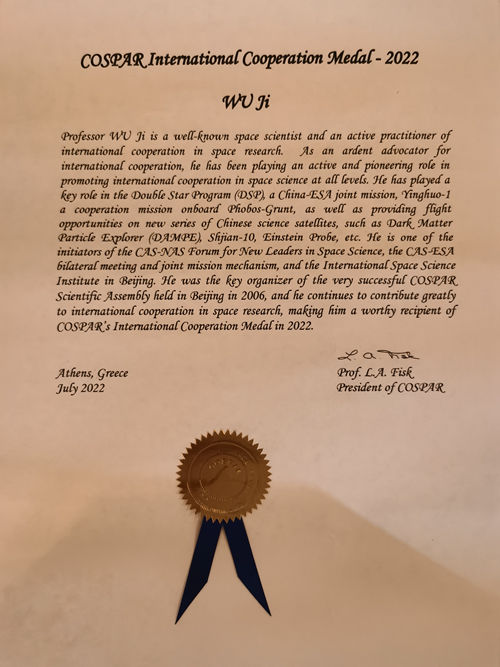 7月18日,在希腊雅典举办的第44届世界空间科学大会(the 44th COSPAR Scientific Assembly)上,中国科学院国家空间科学中心吴季研究员被授予国际空间研究委员会(COSPAR)国际合作奖(International Cooperation Medal)。