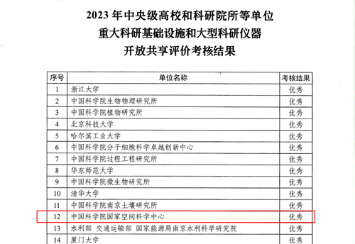 2023年中央级高校和科研院所等单位重大科研基础设施和大型科研仪器开放共享评价考核结果近日公布。中国科学院国家空间科学中心(以下简称“空间中心”)因重大科研基础设施及大型仪器设备运行和开放共享情况较好,在支撑国家重大科研任务、服务国家重大战略需求等方面取得显著成效,再获“优秀”,位列全国第12名(共345家单位参评),这是空间中心连续六年获此荣誉。