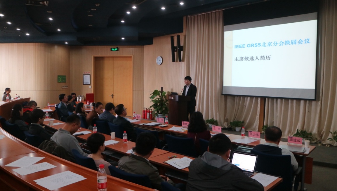 在前任分会主席、中国科学院遥感与数字地球研究所王超研究员的主持下,参会的GRSS北京分会会员进行了对新一届主席的投票选举。国家空间科学中心副主任董晓龙研究员当选为北京分会新一届主席,中国科学院遥感与数字地球研究所施建成研究员、国家卫星气象中心张鹏研究员、北京大学曾琪明教授、中国科学院电子学研究所洪文研究员和中国科学院遥感与数字地球研究所张红研究员继续当选为新一届副主席。随后董晓龙研究员代表新一届主席、副主席致辞,他首先感谢前任主席吴季研究员为北京分会的发展做出的重要贡献,特别是带领团队成功申请和主办了2016年国际地球科学与遥感大会(IGARSS 2016),大大提高了我国在这一重要领域的国际地位和影响力。董晓龙研究员表示将与各位副主席一起,积极为广大会员服务,和大家共同努力做好分会的工作,提升凝聚力,发挥好学会在加强交流和形成学术氛围方面的作用。