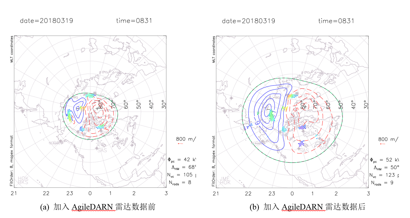 图1 AgileDARN雷达数据对北半球对流图的贡献。AgileDARN雷达数据的加入明显改变了其FOV内电离层对流的走向,并极大地改变了跨极盖电势降。