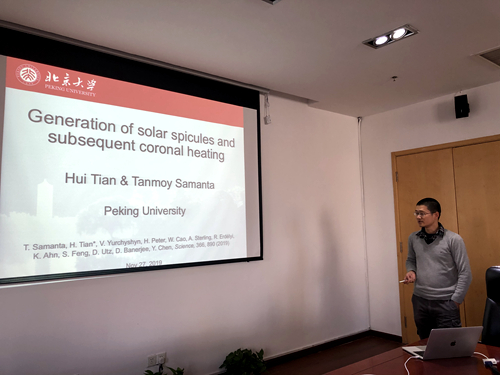 11月27日,应空间中心空间天气学国家重点实验室邀请,北京大学田晖教授在九章大厦天王星报告厅作了题为《太阳针状物的产生与加热》的学术报告。这也是空间中心第三十五期学术沙龙暨建国、建院70周年系列学术活动。