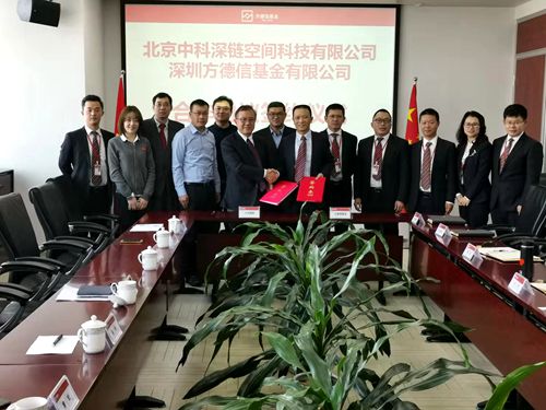 2020年1月14日,空间中心产业化公司北京中科深链空间科技有限公司(以下简称“中科深链”)与深圳方德信基金有限公司(以下简称“方德信”)在深圳举行投资合作协议签约仪式,中国科学院国家空间科学中心主任助理袁庆智、科技处处长曾宏,北京空间科创科技发展有限公司总经理周钢,方德信轮值总裁宁可、副总裁曾胜等代表出席签约仪式。