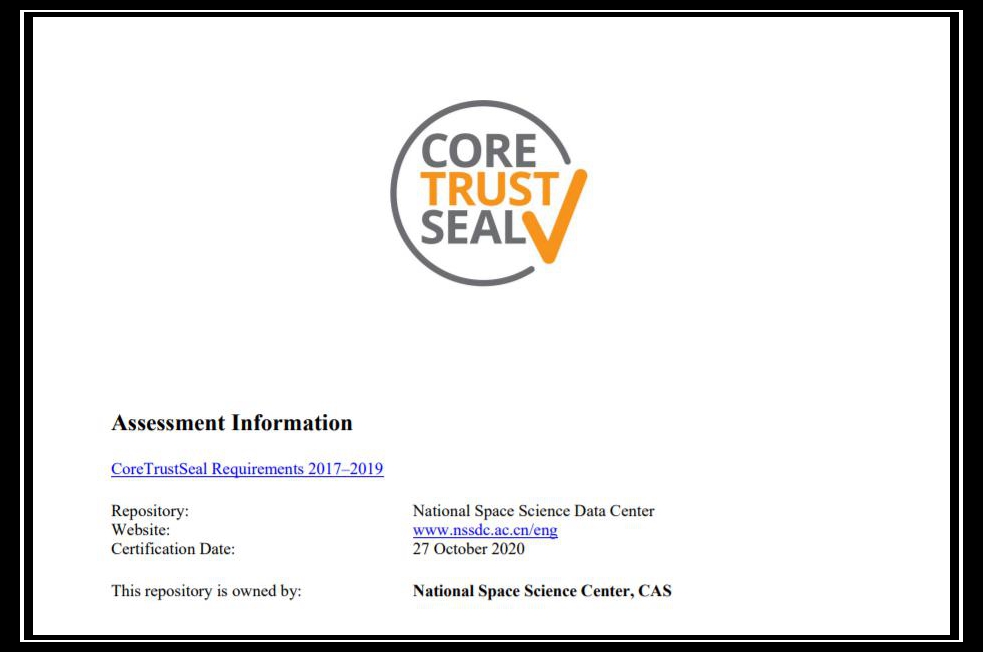 2020年10月27日,国家空间科学数据中心通过CoreTrustSeal国际认证。这是国际科学理事会世界数据系统(WDS)推行全球数据中心国际认证后,亚太地区空间领域首家通过认证的数据中心。