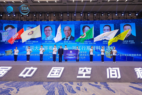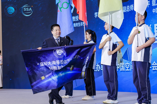 10月15日,在第三届中国空间科学大会开幕式的“星辰大海等着你”浙江行系列科普活动启动仪式上,航天英雄杨利伟向学生代表授旗