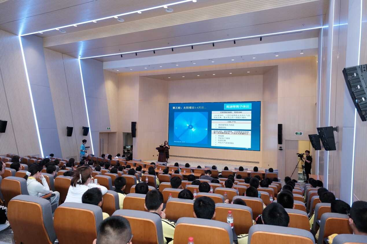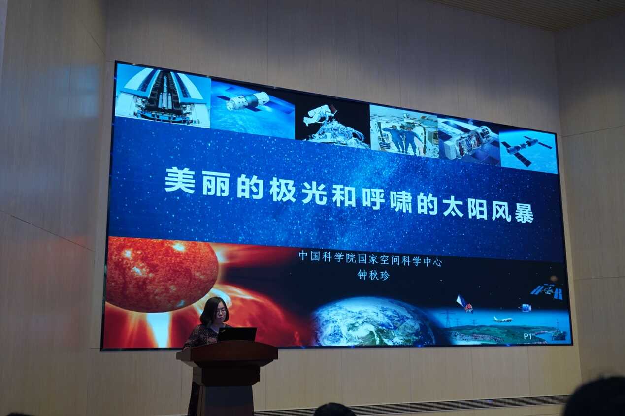 图4 钟秋珍研究员做题为“美丽的极光和呼啸的太阳风暴”的科普报告