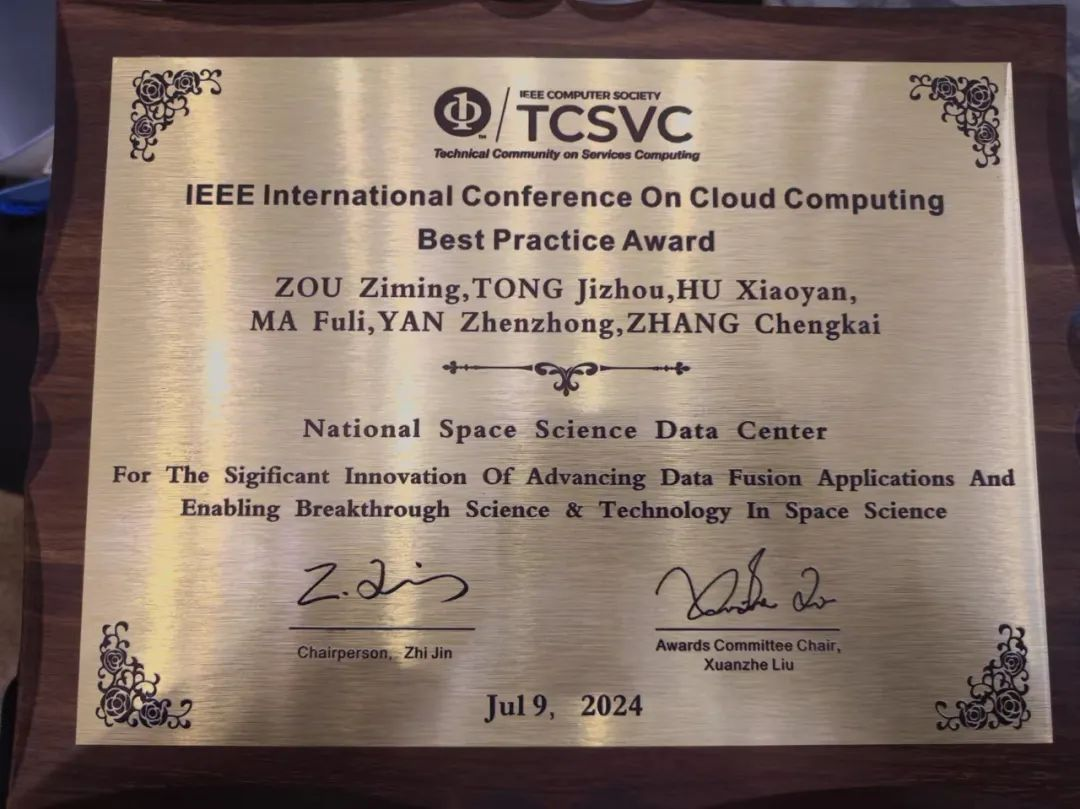 7月10日,国家空间科学数据中心受邀参加在深圳举行的IEEE 2024世界服务计算大会。在此次大会上,国家空间科学数据中心凭借其在云计算领域的卓越实践,荣获IEEE International Conference On Cloud Computing Best Practice Award。