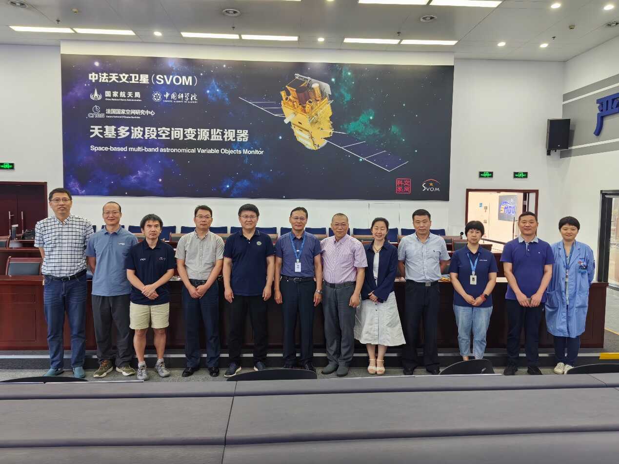 空间中心党委书记、副主任王树志对刘继峰台长一行的到来表示欢迎,运控部主任胡钛介绍了空间科学专项总体情况及中法天文(SVOM)卫星在轨测试情况。目前SVOM卫星载荷已完成开机测试,正在开展科学数据采集和定标工作。卫星平台和载荷各项工作指标正常,遥测、数传、VHF等星地通信功能正常,地面支撑系统、科学应用系统工作正常。