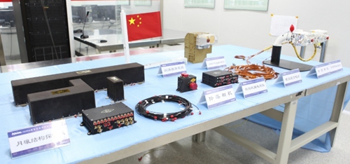 图:嫦娥五号国旗展示 中科院空间中心承担了嫦娥五号有效载荷总体工作,有效载荷分系统配置了7台(套)科学载荷,用于完成采样区现场就位科学目标探测,为有选择地进行月壤取样提供了依据,建立了现场探测数据与实验室分析数据的联系。同时,还承担了着陆器上的载荷数据处理器的研制,用于有效载荷分系统一体化设计,满足有效载荷系统工程设计约束,同时还配备了一套地面综合测试系统,用于各阶段的集成测试和综合测试。 中科院空间中心的科学家通过对嫦娥五号采回的月球样品开展了地面分析研究,获得了一系列的重大科学成果。例如,揭示了嫦娥五号着陆点月壤矿物组成和太空风化作用等。