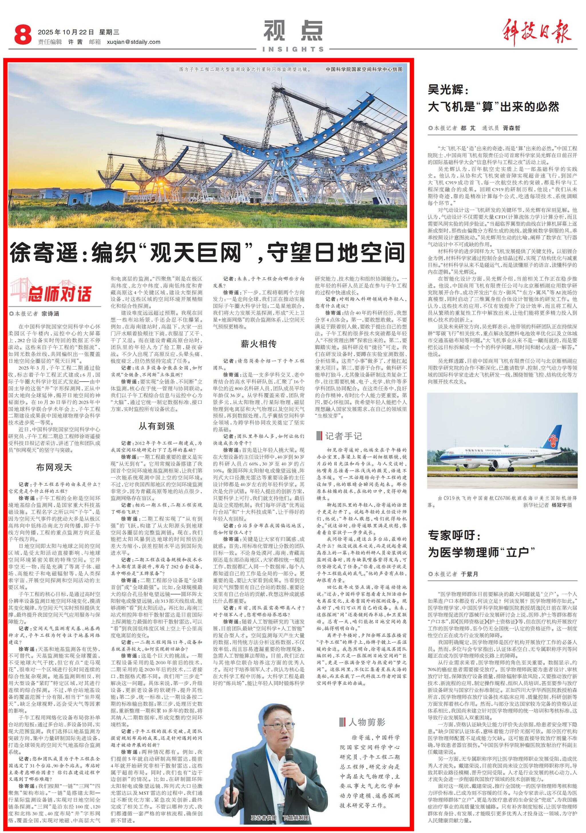 徐寄遥:结合40年的科研经历,我想分享4点体会。第一,要敢想敢做。不要满足于跟着别人做,要敢于提出自己的想法。子午工程的很多技术突破都是年轻人“不按常理出牌”探索出来的。第二,要脚踏实地。搞科研没有“捷径”可走。我们在研发设备时,要蹲在实验室测数据、分析结果。这类“小事”做多了,才能扛起重大项目。第三,要善于合作。做科研不能单打独斗,尤其像设备研制这类复杂工作,往往需要机械、电子、光学、软件等多学科团队协同配合。在这类任务中,良好的合作精神,有时比个人能力更重要。第四,要心怀祖国。我希望年轻人能把个人理想融入国家发展需求,在自己的领域里“生根发芽”。
