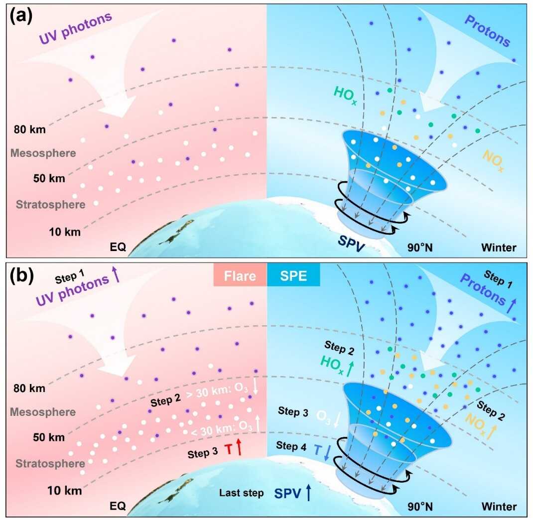 近日,空间中心太阳活动与空间天气全国重点实验室王赤院士团队的李晖研究员与硕士生李雅轩,基于GOES卫星的质子通量数据和ERA5再分析数据,明确了太阳高能质子通量、紫外辐射强度和极涡强度改变量之间的定量关系,找出了太阳耀斑伴随的SPE期间影响平流层极涡变率的关键因素,并进一步探究了SPE影响平流层极涡的潜在机制。研究发现:1)在北半球冬季,SPV对SPEs有表现出明显响应,且与高度相关(图1)。2)太阳高能质子通量与SPV增强之间存在正相关(图2)。3)与太阳耀斑相关的紫外辐射增加是平流层顶区域SPV增强的主要驱动因素。而在平流层中下层,太阳高能质子对SPV增强的驱动作用更为显著。4)提出了通过不同的臭氧响应放大经向温度梯度来增强平流层极涡的潜在机制(图3)。