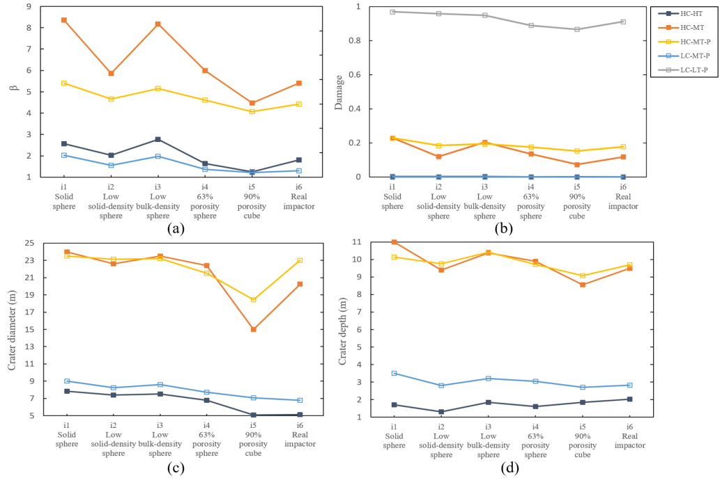 图3不同场景动量传递因子与撞击坑尺寸统计。对LC-LT-P的破碎场景仅统计损伤。(a)动量传递因子;(b)小行星损伤程度;(c)撞击坑直径;(d)撞击坑深度