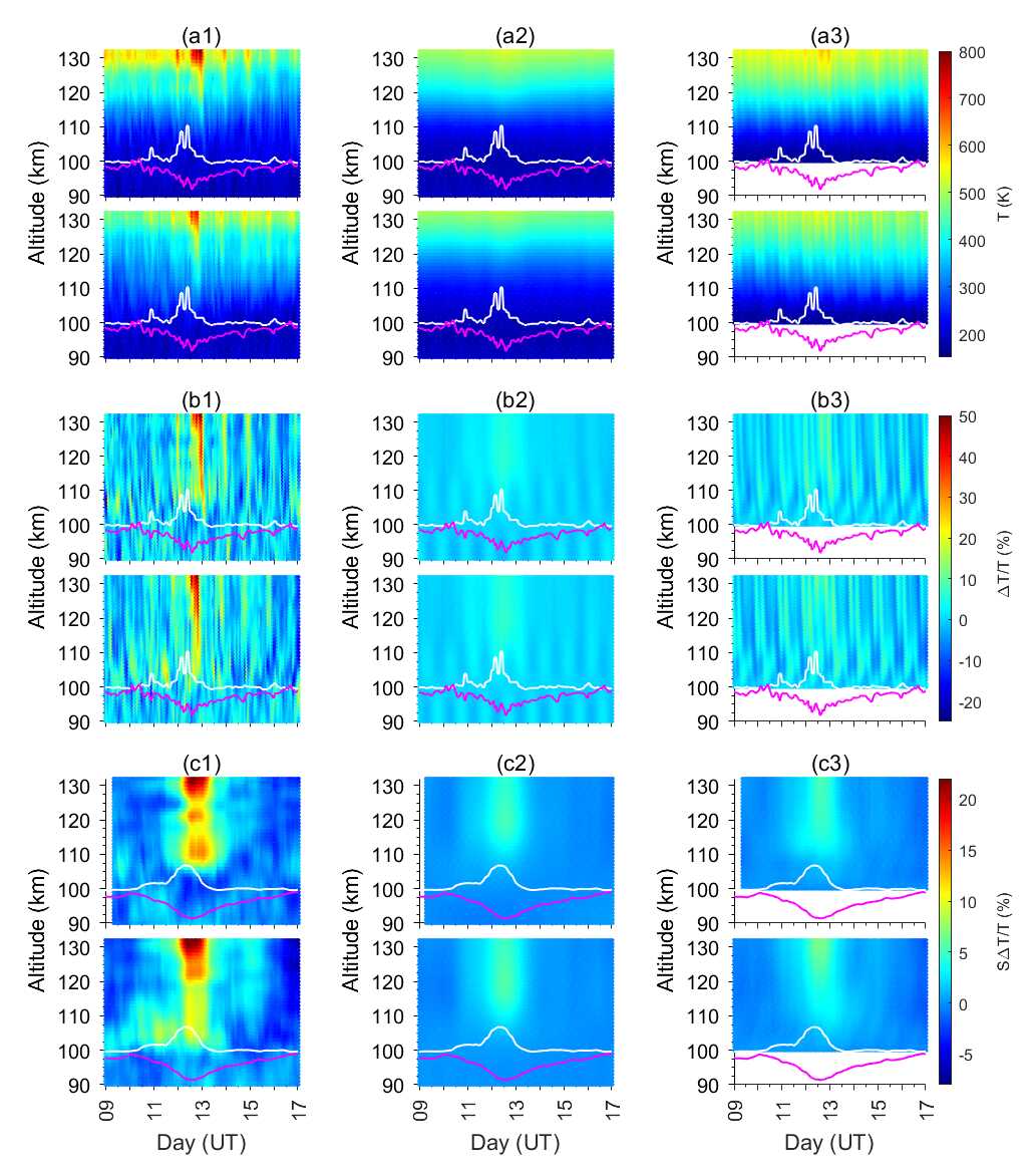在磁暴期间,太阳风和磁层能量注入高层大气。这些能量通过热传导、环流和波动等过程在全球范围内重新分配,进而影响大气温度、密度和化学成分等大气参数的全球分布。低热层作为中层大气与高层大气的过渡区域,不仅承受来自上方的太阳辐射和磁层能量注入,还受到来自下层大气上传波动的影响,成为上下层耦合的关键区域。然而,由于观测的困难,对110公里-200多公里的低热层大气温度和密度的观测研究几乎处于空白状态,这一区域被称为“热层间隙”(thermospheric gap)。2022年2月初的中等磁暴造成38颗星链卫星发射期间在该区域陨落,再次证明了该区域的重要性以及目前对该区域认知的缺乏。