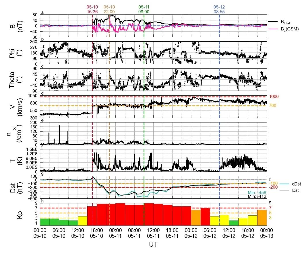 图1 2024 年5月风暴期间的太阳风、行星际环境以及地磁Dst和Kp指数。从上图到下图依次为:行星际磁场及南北向分量、GSM坐标系中的磁场经度和磁场纬度、太阳风速度、太阳风密度、离子温度,以及地磁活动指数(Dst/cDst和Kp)。
