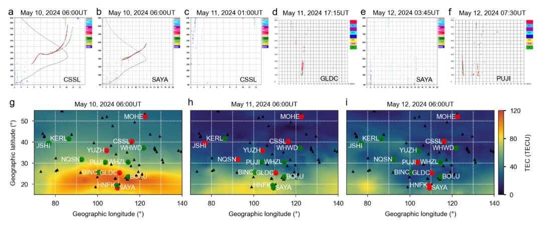 图2 子午工程观测到的中国地区TEC的降低和高频电波信号中断。(a-b):2024年 5月10日06:00UT,CSSL站(116.20°E, 40.30°N)和 SAYA站(109.63°E,18.35°N)的数字测高仪电离图。(c-d):2024年5月11日,CSSL站在01:00UT 以及 GLDC 站(110.35°E,25.35°N)在17:15UT 的电离图中断情况。(e-f):2024年5月12日,SAYA 站在03:45UT以及PUJI站(103.62°E,30.31°N)在07:30UT的电离图中断情况。(g-i):2024年5月10 -12日06:00UT中国地区的TEC。红点表示由于电离层负面影响,全天出现电离图中断的电离层探测站位置,而绿点表示未出现中断的站点。小黑三角表示全球导航卫星系统(GNSS)接收机的位置。