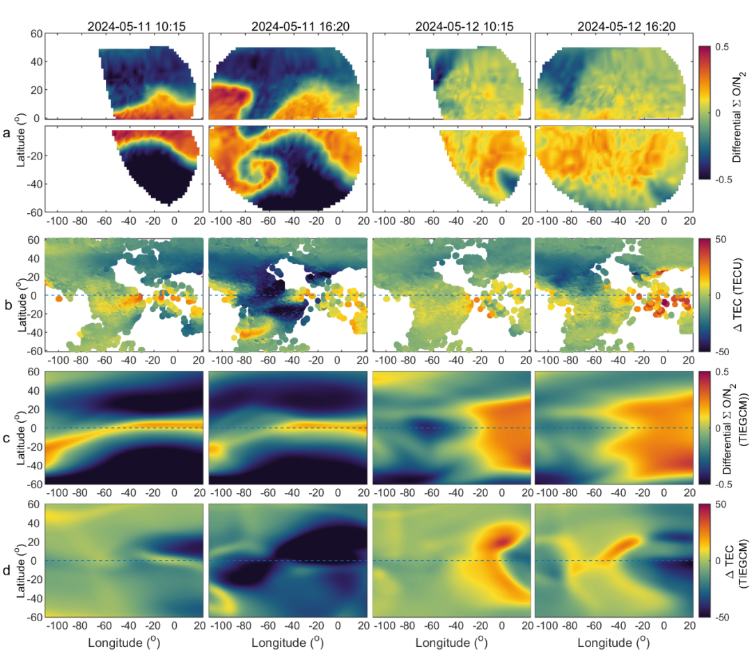 图4 2024年5月10-12日10:15UT和16:20UT ΣO/N2和ΔTEC的观测与模拟。(a): GOLD卫星观测的ΣO/N2的变化。 (b):从madrigal-TEC数据库得到的ΔTEC。(c):TIEGCM模拟的ΣO/N2。(d):TIEGCM模拟的ΔTEC。